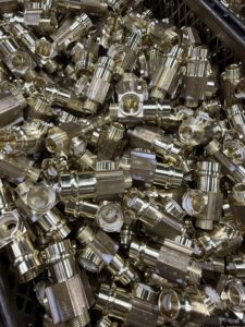 A: Our brass rod is bought in 16′ length rods with predetermined outside dimensions. We truck in the rod from a nearby facility with our own semi trucks. Through machining, we use preset tooling to turn, drill, and thread the brass using a precision rotary transfer machine.